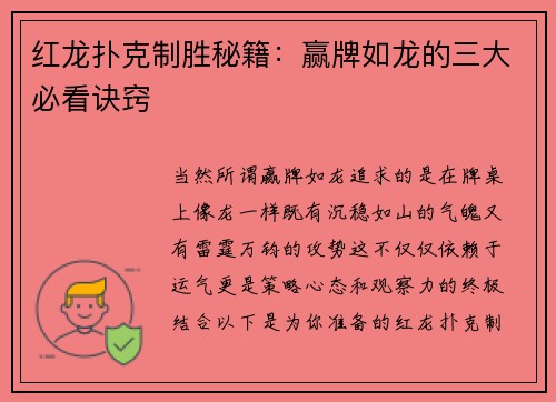 红龙扑克战队作为国内扑克界的“梦之队”,吸引了许多扑克爱好者的目光。要加入这样的精英队伍,确实需要满足特定条件并抓住宝贵的机会。下面这份攻略会为你指明方向。 认识红龙战队与加入途径 首先需要明确,红...